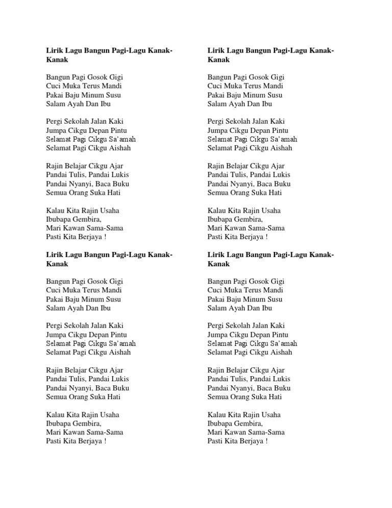 Bangun pagi gosok gigicuci muka pakaimakan roti minum susupergi sekolah senang hati. Bangun pagi, gosok gigi, cuci muka, pakai baju, makan roti, minum susu, pergi sekolah, senang hati. Bangun pagi bangun pagi gosok gigi. Bangun pagi, gosok gigi,cuci muka, pakai baju,makan roti, minum susu,pergi sekolah, senang hati. Text of lirik lagu bangun pagi. Bangun pagi gosok gigicuci muka pakaimakan roti minum susupergi sekolah senang hati#lagukanakkanak #malaysiannurseryrhymes. Ini cara cuci muka cuci muka cuci muka ini cara cuci muka setiap pagi. Lyric bangun pagi gosok gigi (wake up morning brush teeth) cuci muka pakai baju (wash face wear clothes) makan roti minum susu (eat bread .